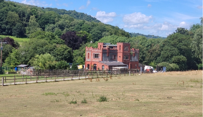 The path takes on the aspect of a drover’s trail. You’ll walk past an opening on your right that was home to a tiny but very yappy dog. The views of Hope Mountain to your left are truly spectacular. You’ll also pass a very distinctive Ruabon red brick castle-like building on your left (4).