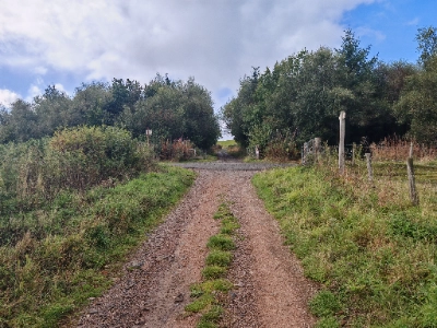Follow the path ahead down the slope and through the gate. It’s slightly overgrown as you make the gentle descent, but nothing too bad. Turn left along the grassy track that resembles a drover’s trail just before the metal gate (9).