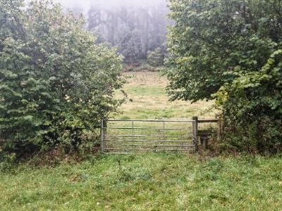 ** The public footpath actually takes you over the stile by the gate and then up along a woodland path. However, it’s in a poor state and quite slippery, with parts of it crumbling and slanting rather steeply down towards the field. **
