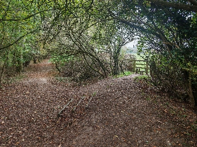 Go through the metal kissing gate. Continue in the same direction in the next field. You’ll start walking along a fence bordering a wood on your left. Turn left through the metal kissing gate into Oliver’s Wood, walk along the path and turn left down the steps just before the stile. Take the right fork (10).
