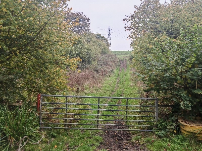 Turn left through the rusty metal gate and then immediately right. Follow the path with another electric fence on your left and the high hedgerow on your right. Climb over the peculiar low ladder stile on your right (4) as the track bends sharply to the left after about 200 yards.