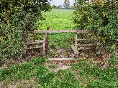 Walk straight over the field and take another stile to exit the field. Be careful, as only the bottom step remains. Use the hawthorn trees either to support yourself as you climb over.