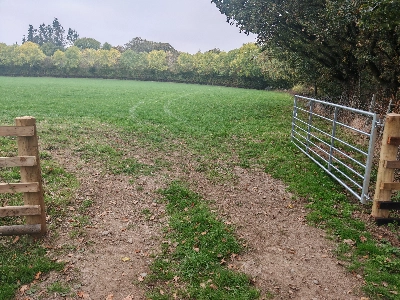 After a couple of minutes, you’ll reach a path running across you with a gate and a stile in front of you. Hop over the stile and follow the path in the grass to the right of the copse of trees, more or less in front of you. Cross the track that leads to the Brynkinalt Estate to your left.