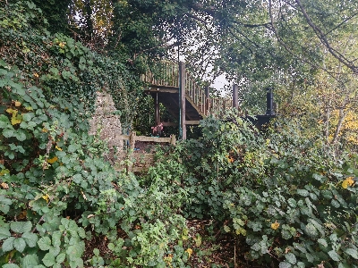 As you get closer, you’ll notice a gap in the brambles and nettles to your left. If you’ve passed the grey wooden outbuilding with the chimney, you’ve gone too far.
