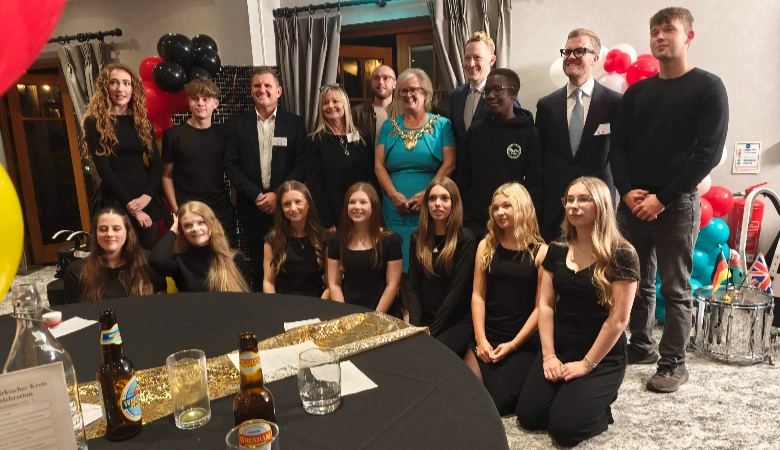 As we reported in October’s magazine, a celebration took place at Hotel Wrexham in mid-October as part of a visit to our county by our German twin town, Märkischer Kreis. The evening was a great success and notable for the presence of Deputy German ambassador Christian Doktor, Wrexham mayor Tina Mannering and the performances of the Spielmannszug Drüpplinsen marching band. Theatr Yr Ifanc Rhos 1990 sang for the audience in Welsh.