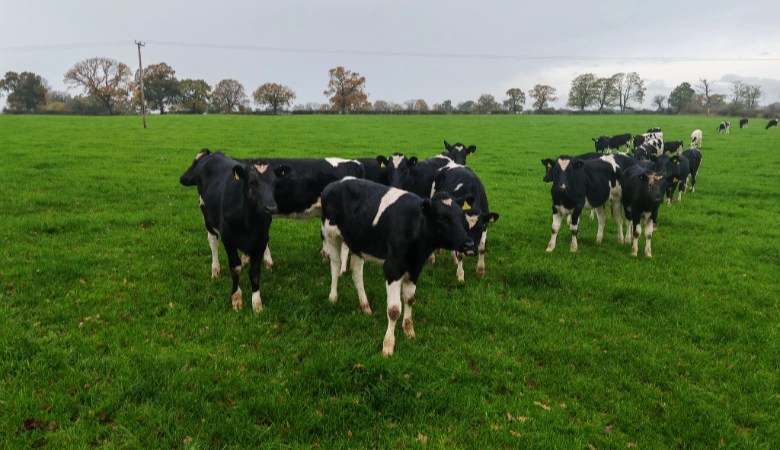 Go up the slope in the next field, heading roughly to the right of the farm buildings.