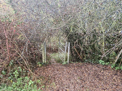 Walk along the left-hand hedge and fence line until you’ve almost reached the end of the field, and then turn left through and go through the metal gate. You might have to duck to avoid the archway of brambles overhead. Walk diagonally right and exit the field through another metal gate a short distance away.