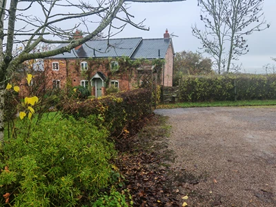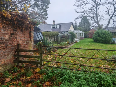Turn right a little further on here at the yellow chevron and walk along the narrow path, possibly over some fallen apples, and through the wooden gate. Go straight on past Lightwood/Lightwood Bungalow on your left. At the next house on the left – Mona Cottage – turn into the drive after the house itself and then turn left again. You’ll spot a stile ahead (9).