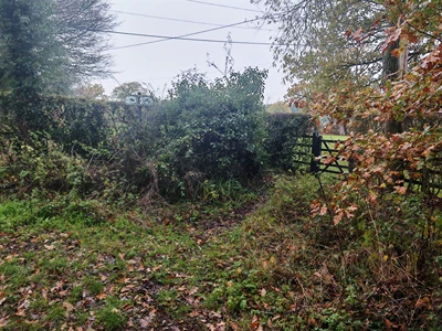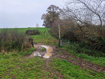 Go through the gate into the field and follow the fence of the house on the left. Gird your loins before climbing over the stile in the hedgerow ahead.