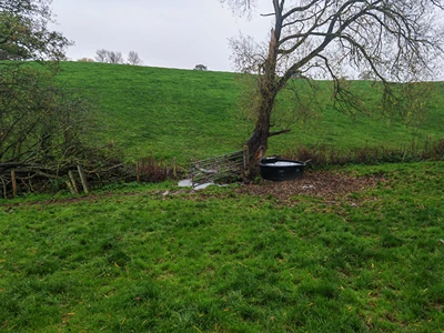 Climb the rise in the next field, following the right-hand hedgerow and trees. After 150 yards or so, exit the field on the right through the metal gateway. Walk straight on and down the slope. Go through the gate at the bottom, about 100 yards to the right of the track, up to the farm. You’ll see a large, black water butt next to the gate and a yellow arrow waymarker on the wooden gatepost (3).