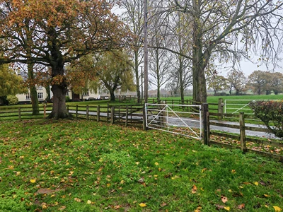 Ignore the metal gate on the corner of the hedgerows ahead of you when you enter this field. Instead, walk straight on, following the right-hand hedgerow. You’ll pass a couple of solitary oak trees and a white farmhouse diagonally left ahead of you. Turn right through the metal walker’s gate just after the second oak tree.