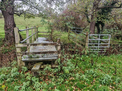 Head slightly diagonally right and hop over the stile ahead in the far fence line. Walk down into the dip and cross the stream using the left-hand bridge with the stile at either end (5).