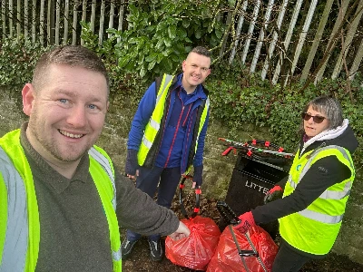 In Cefn Mawr, Rhosymedre and Newbridge, volunteers recently proved that small teams can make a big visual impact. Hoopy and Jacqueline Palmer led an extensive clean-up across Cefn Mawr and Rhosymedre. They collected 36 bags of litter and removed items, including from tyres, carpets, car parts and a discarded foot spa. They cleared overflowing bins, recycled dumped boxes and tackled tricky areas such as steep banks and an eroded railway bridge. The team did all this in poor weather and on challenging terrain.