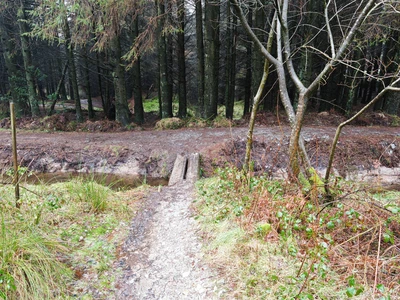 Walk down the path, so the higher one is up to your left, and continue downhill on this rocky woodland track. You’ll know you’re on the right path because you reach a point at the bottom of a slope where you have to cross a stream. There are two wooden bridges covered with wire netting to your left. However, I would not advise using those because the step down from the first one is rather badly damaged, so I would just stick to the path. Once over the stream, follow the path round to the left.