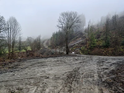 Shortly after taking the stile, turn left off the track and walk along the grassy lower path for about five minutes. Take the diagonal turn-off right up the slope to join a higher path. Stay on this track for the next half mile until you drop down into an area that has been cleared of trees. There’s a wooden gate to your left and a sign saying ‘Warning’ with a yellow triangle ahead of you.