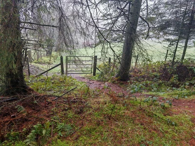 Go through the gate, walk up the short path and hop over the stile to the left of the next aluminium gate a few yards further along. You find yourself on another path with the forest to your right, open fields down to your left, and the A525 going towards Ruthin.