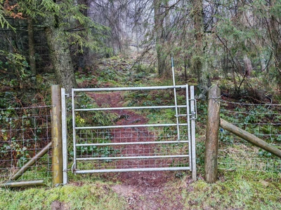 Don’t miss the dramatic view a few minutes later as you look left down into a steep-sided river valley with the meadows and fields beyond. A minute or so later, you’ll walk through a wooden gateway with a bench to your right and an information board headed Llandegla Forest.