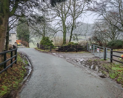 There are parking spaces on either side of the side road. Head back the way you drove to the parking and turn right, following the bridle path sign on your right. Go through the horse gate to the left of the wooden vehicle gates and walk up the well-maintained concrete drive with the grass verges in the middle.