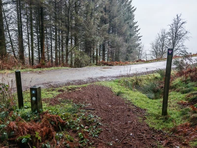 After about seven or eight minutes’ walk, you’ll reach a point where you can take a sharp right to a house, but we go straight on through the wooden gate with the blue vertical arrow. Walk a few yards up the right-hand edge of a field, through a metal gate, and turn left along the woodland path into the beginnings of Llandegla forest (1).